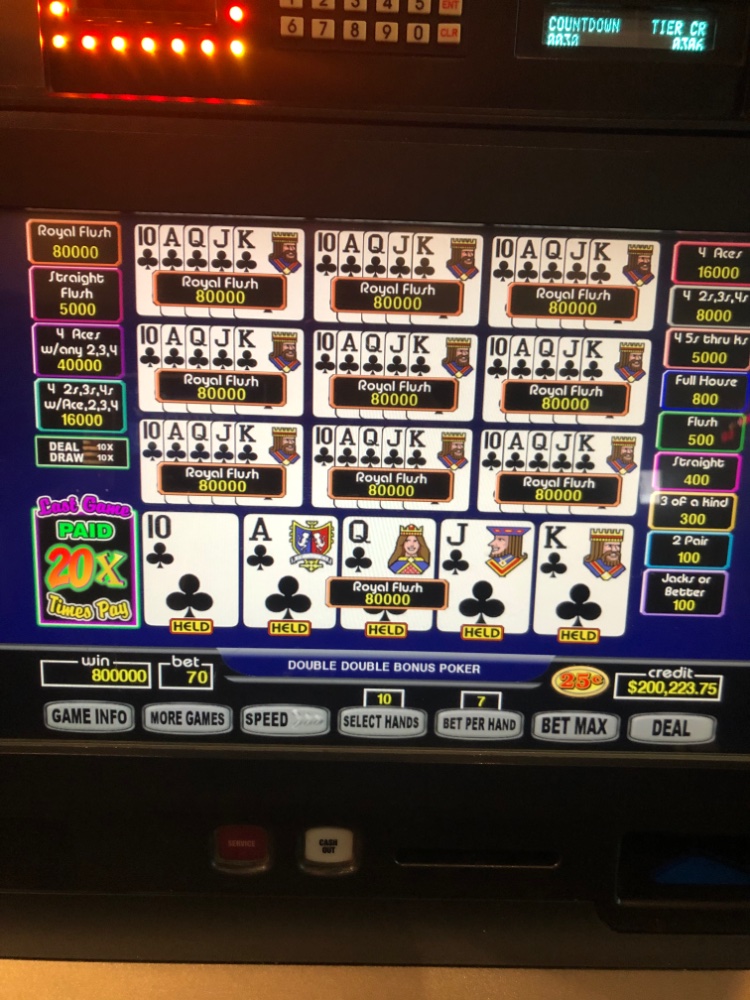 I was visiting Biloxi in February 2020, staying at Harrah’s Gulf Coast. I had been playing all day and losing. Remembering I had some birthday FP at The Beau Rivage, I went over there hoping to turn my $150 FP into at least $300. I was not very optimistic since I had been losing and was just about out of money. Lo and behold! I ended up hitting 2 Jackpots at The Beau Rivage and leaving with $2,500. To say the least, I was thrilled since I had won back most of what I had lost and was going back home to Texas the next morning. I returned to Harrah’s and “decided” to go into the casino to “smoke 1 cigarette.” Well... I started playing Super Triple Play draw poker and promptly lost $1,000 of my newly won money. Moved one seat over to the Double Super Times pay Poker and started playing 10 lines, Double Double, 25 cents, max bet. Disgusted with myself for losing even more money, I finished my drink, put my cigarettes in my purse, ready to leave, and decided to play “One More Hand!” It dealt me 4 cards to a RF, 10