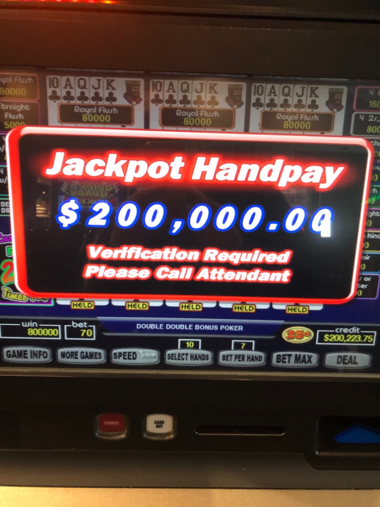 which completed the Royal Flush and then the 10X changed to 20X. I Won $200,000 on a $17.50 bet!! When I called my husband who was at our home in Texas to tell him, I had to repeat it 3 times before he really understood, lol. It was late and he was asleep. Later, he said he thought that he had dreamed it.