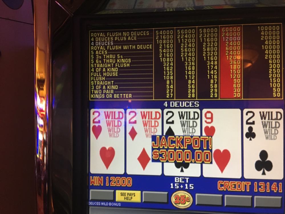 After a short break, I budgeted $300 to play the very risky double down stud bonus deuces wild game. Only 97%. However, I was extremely lucky to hit the Dealt quad deuces. I immediately headed home. Too tempting to stay and play.