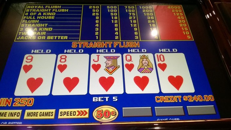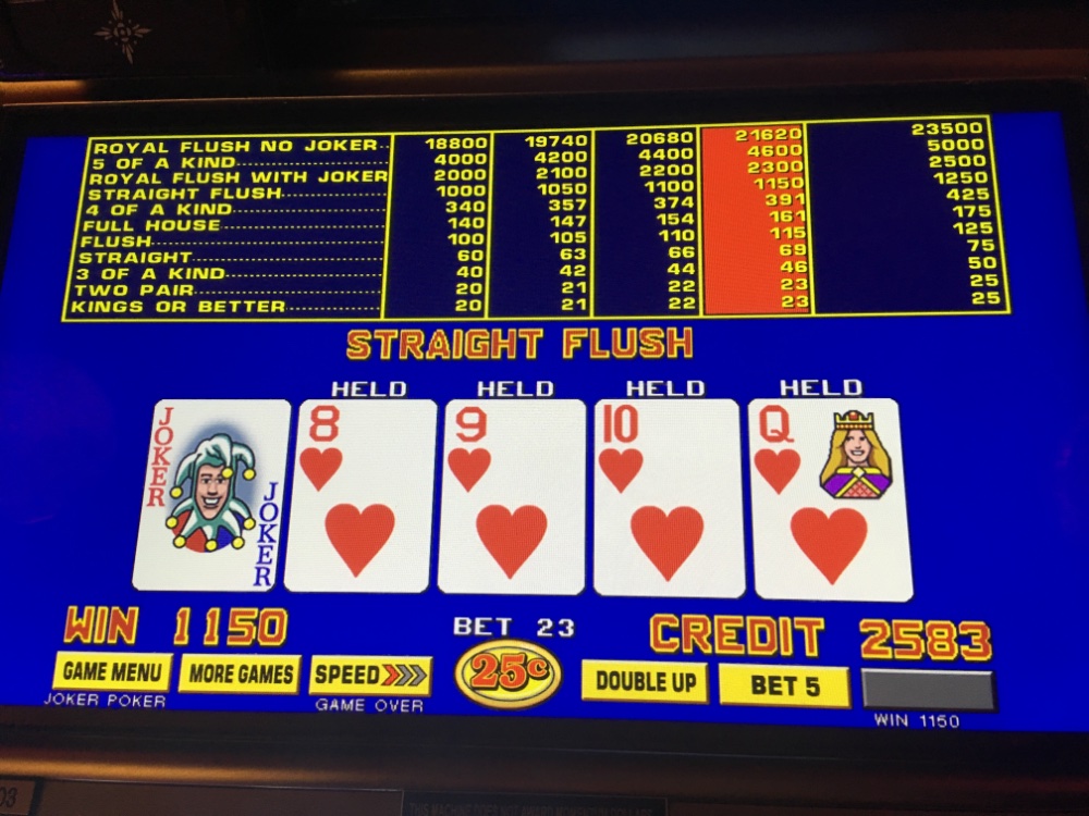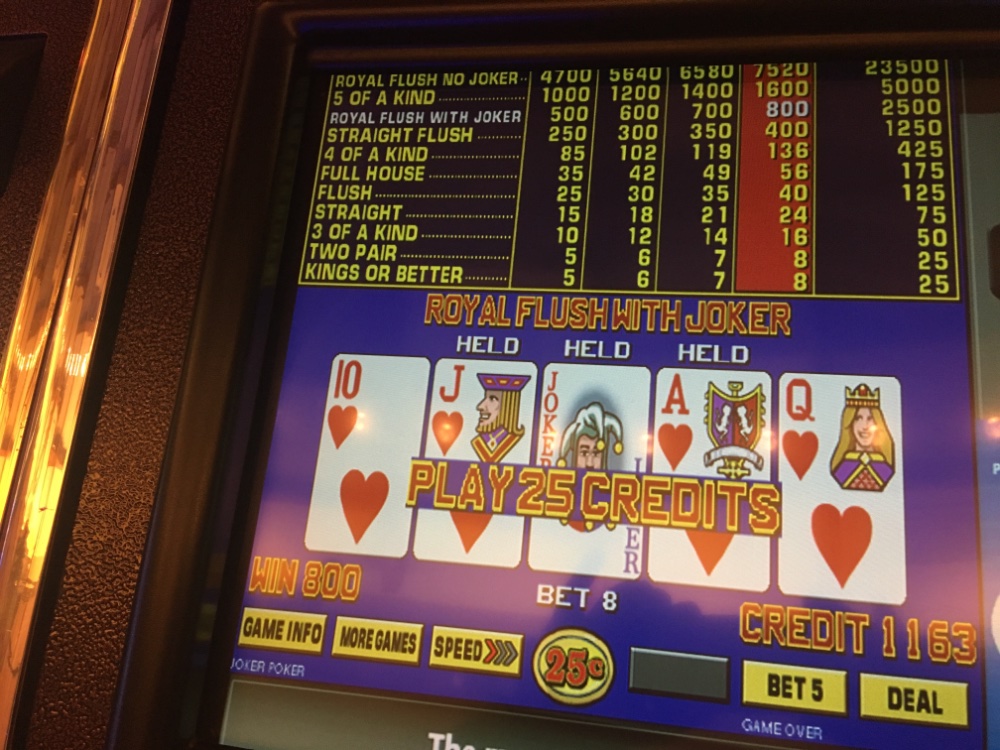 Last trip before the big storm. Heading home now. Stuck with joker kings all night. As you can see from the pictures it wasn’t too bad at all. Ended up about 200 bucks and that is without a royal other than the wild royal and no 5 of a kind. The straight flushes and the one Wild royal kept me hanging in there. The bets got awfully high as you can see from the one big straight flush hit