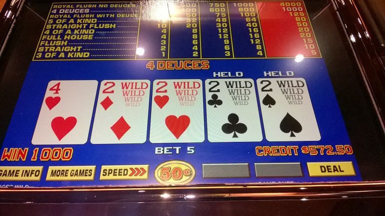 I then went to my other casino for some play. A few weeks ago they reprogrammed the Bar #2 I play. How I know this is the back ground screen was blue all the way across and now there is a strip of black on each side. Today 4 of a kinds as has been the rule for weeks very rare. Yet a dealt SF and for the first time in months 4 deuces came in.