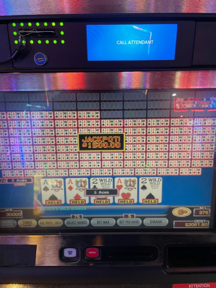 Monday and Tuesday trip to Golden Nugget Lake Charles to play 2X points on Monday to complete Sweet C's tier level requirements before Feb. 1. Got that completed but no hits of any mention and down all trip. Packed early Tuesday afternoon after a great steak lunch/dinner at Salt Grass-thank you weekly food comps. Bags packed in the car and I asked Sweet C if she wanted to delay checking out and go to Coushatta (40 minutes away with the best VP in La. - 98% VP returns) and our old time favorite until GN opened with better comps. A smile told me all I needed to know, pulled the last from our rock bottom "401G" account when we got their and save $3 on the ATM fee. Our tentative plan was to play, then head home and check out from GN on the way. Got there around 4:30, played our favorite machines and kept hitting enough to stay in the game. Finally, a little after 11:00 pm, having already cashed out $1K, I caught this little ACES gem. Then another $1K tickets fueled us until at 2:00 a.m. exhausted we head back to our bed at GN. Recouped all our GN losses and rebuilt the 401G. Makes us 2G's for two trips in '22. Of yeah, and since Coushatta is a Native American casino-not taxes taken out!!!!