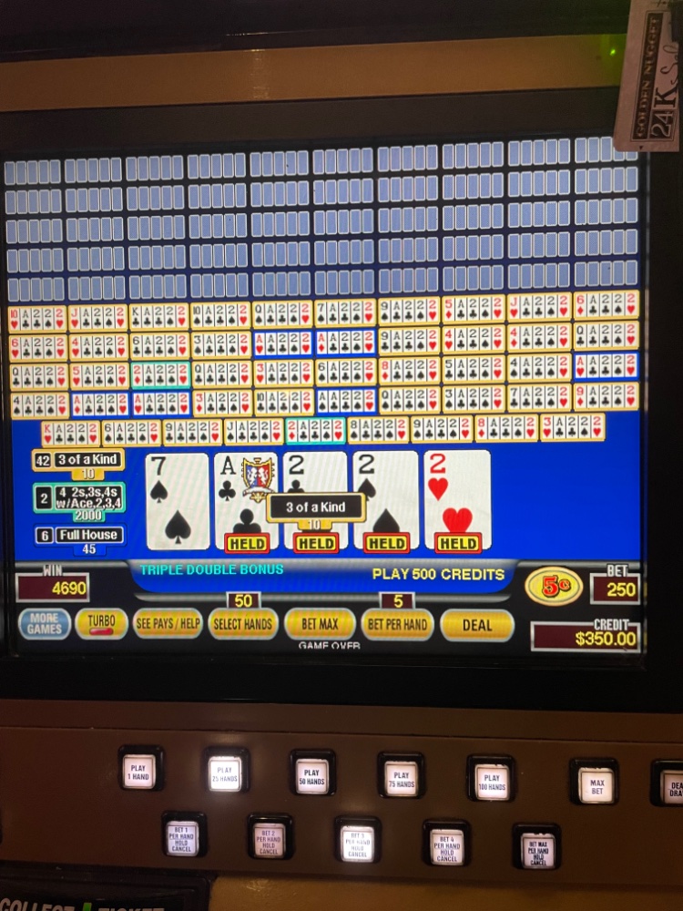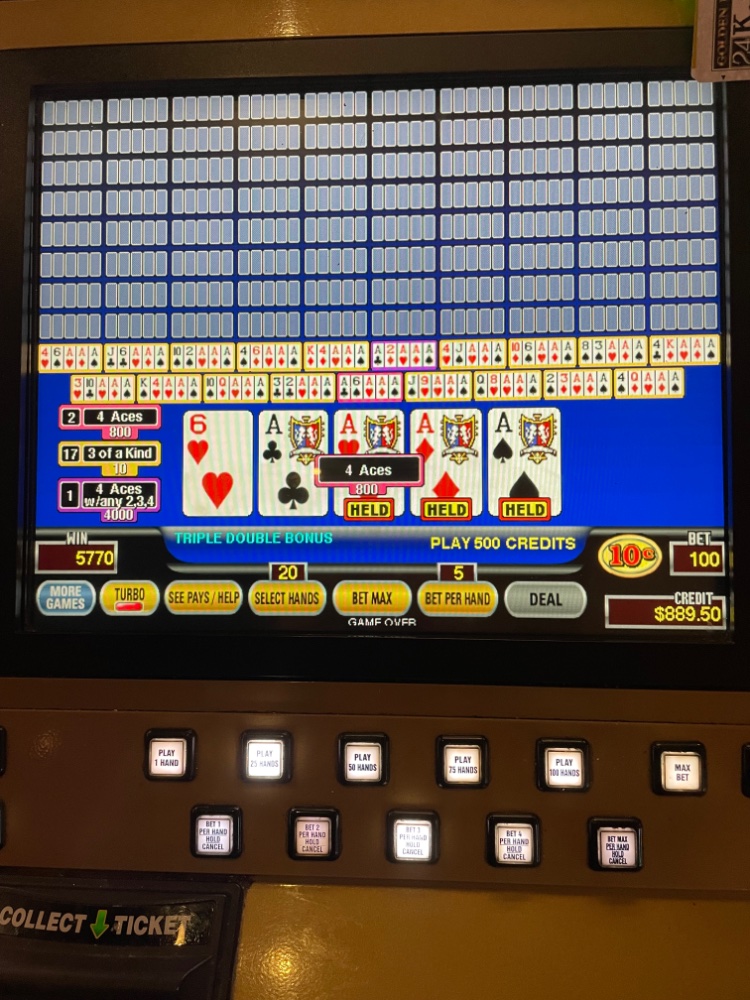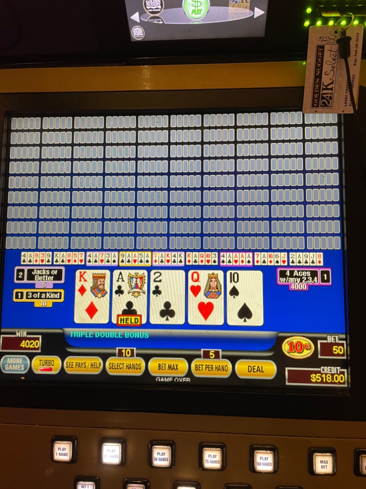 Sweet C and I usually take a two day trip and come home late on Day #2. We usually eat an late afternoon dinner and play $100 each before heading home. Sometimes we can play a short time and head home other times we get on a roll. Within 20 minutes Sweet C came around to where I was playing 10¢-10 hands/deal on a 100 play machine. DDB gave me a quad Aces for a nice $80 bump. A premonition told me to go to TDB which I may play .001% of the time. A few hands in a dealt A hits Aces /4 for $400. Cash out and bankroll Sweet C. A few minutes after resuming and moving up a hand or two at a time up to 20 hands 3 Aces led to 1X4 Aces and another 4 Aces/2. 30 minutes later and up to 27 hands AK10 spades on DDB led to to RF. Less than 10 minutes later back on TDB dealt A222 led to 2XA2222 for another $400. Thirty-three hands and dealt 22 on DW led to 2 4Deuces. Twenty minutes and shortly after 6:00 35 hands with AA caught one AAA4A to closed out the evening and a drive home.