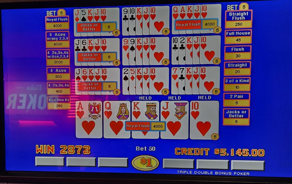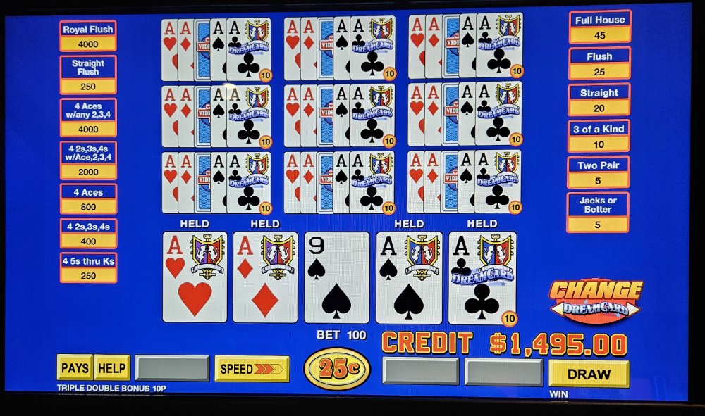 After settling into the comfort(?) of my machine, I was up, down, up, down, down, down. Getting almost ready to leave, I was dealt 3 to the royal, and bam! After getting paid, I tossed a couple hundred back into the machine and decided to stretch my legs and try a different machine. After seeding, I got a tingle and bam! Hit 5 OAK. A Dream Card machine opened up and while waiting to get paid from the 5OAK, I sat at the Dream Card. A few minutes in, Bam! Dealt 4 aces, said thank you under my breath, and hit deal. Caught 3 kickers. Hit a couple other ACJP straight flushes along the way but no pics of them.