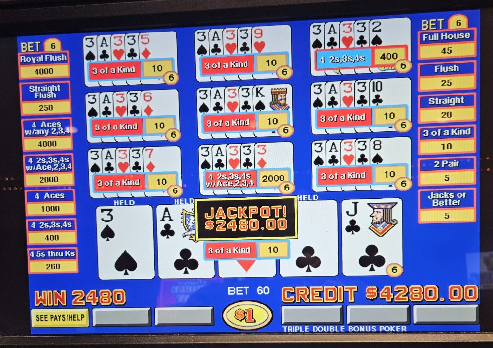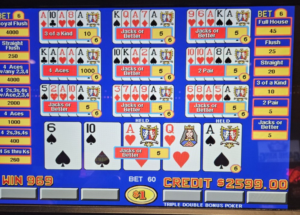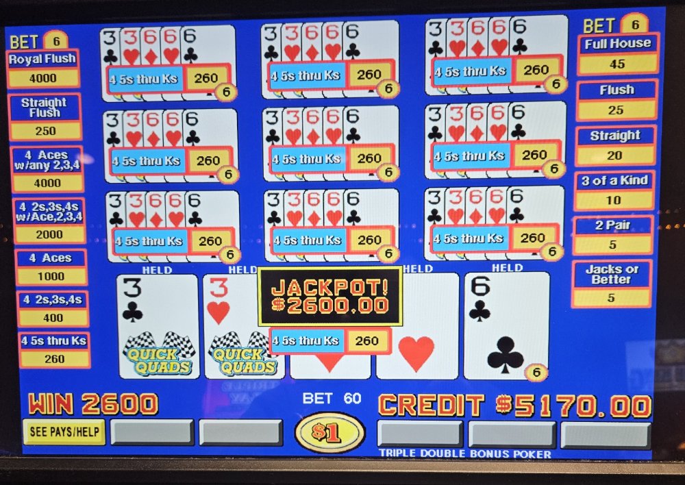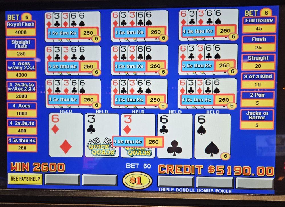 I felt the need to play some live Quick Quads this morning and seeing that I had some freeplay waiting for me at Hollywood, Aurura, IL, I decided to take an early morning drive over. I started out playing some regular 10 play TDB and lost about $300.00 before switching to the Quick Quads machine. Started out hitting a couple small quick quads, then the floodgates opened. The below hits all came within 1 hour and the order of pictures is the order they hit. You are not seeing double looking at the pictures of the dealt quick quads.