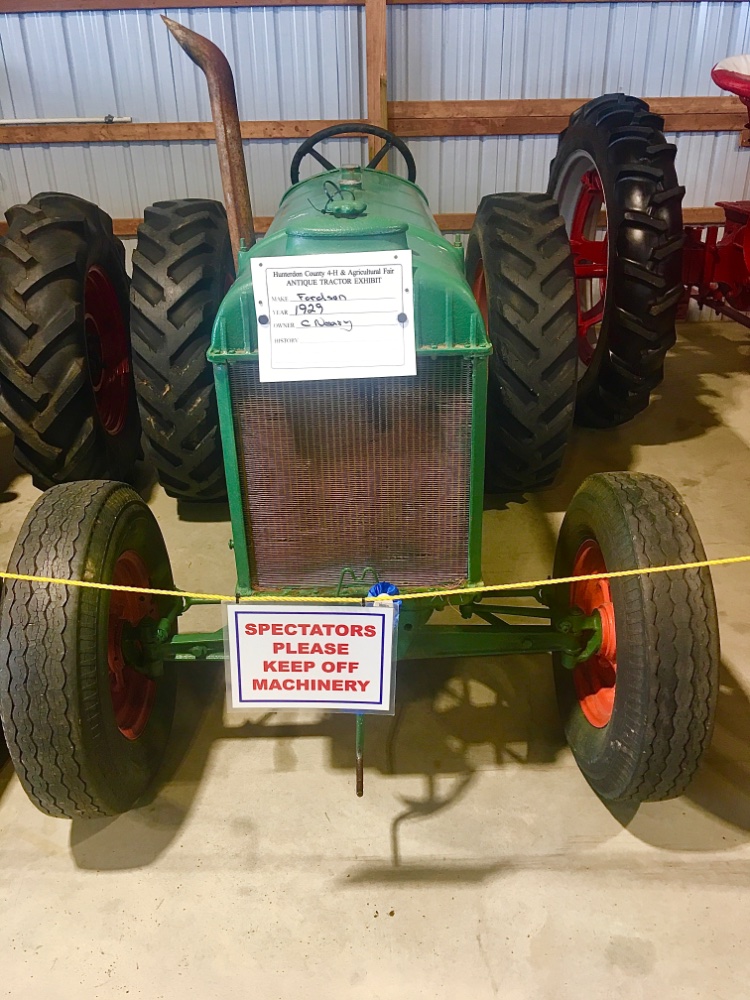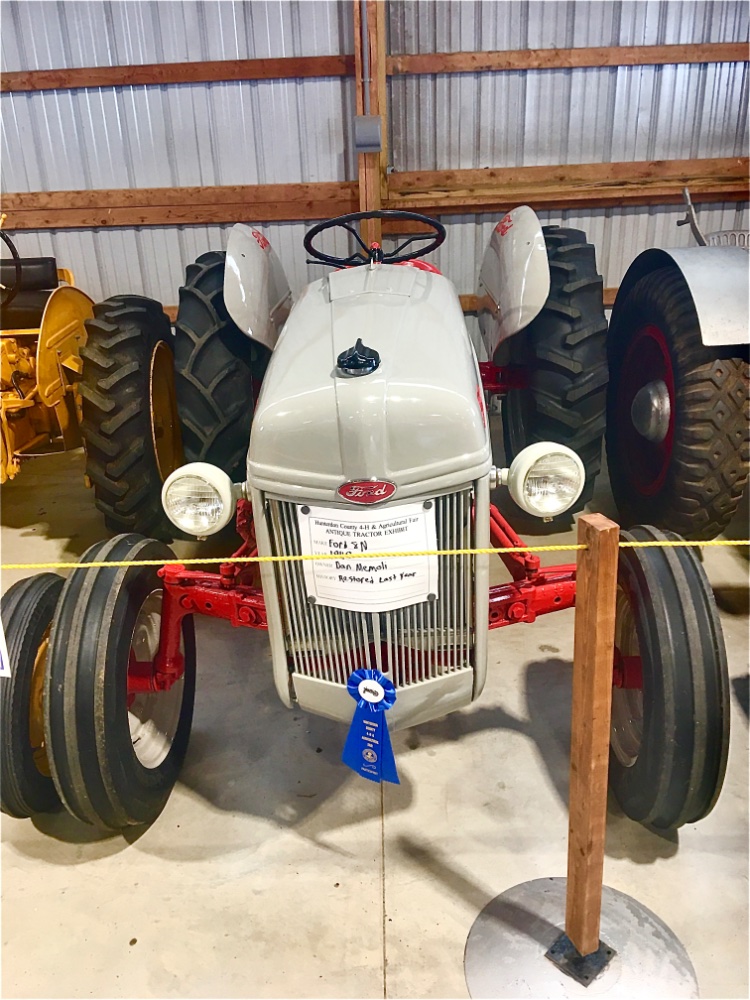 FAA and the flight crew hit the county fair five miles from Flemington, NJ. $15 a car was a steal. Plenty of rides, a petting zoo featuring a llama and a stilt walker named Chachi. Four barns: cow, horse, goat, sheep. Also about 80 tractors under one roof going back a century. Here’s a front and side view of a 1939 Ford 9N. I love how the flag overhangs the side view. The 8N was a doozy too. I was intrigued by the Fordson. This Henry Ford brand began in 1917 and was the first lightweight mass produced tractor affordable by the average farmer.