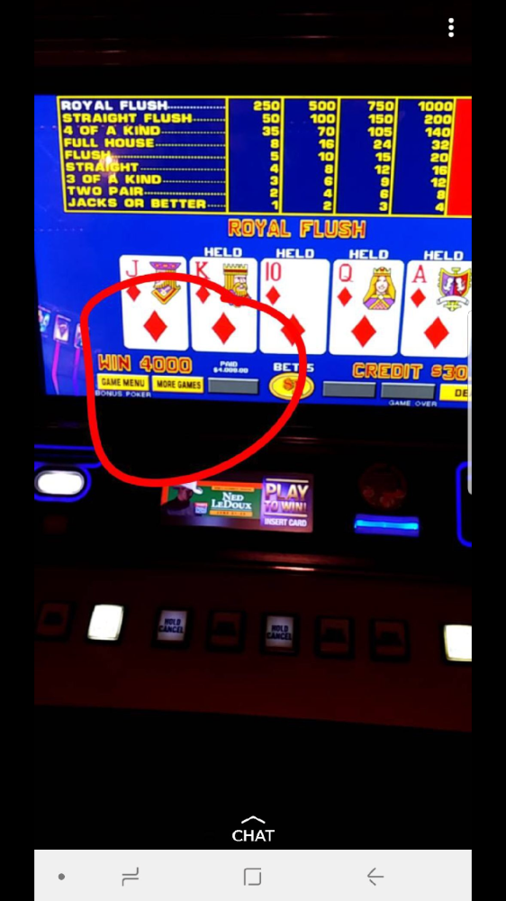 Sorry I've been away for awhile, I put video poker on the back burner for awhile after my last Laughlin trip.. last week I was finally back in Laughlin on a free flight. On my second day I was delt a flush, however I also had 4 to the royal.. if you remember me from earlier this year I was asking tons of questions about bankroll and charter flights, during that time I was doing as much research as I could about misplayed hands and getting to the WHY some hands are held in certain situations.. there is a YouTube video with Linda Boyd where she talks about letting go of the made hand and going for the royal. Without knowing the math I trusted her (and my WinPoker app). Low and behold my royal was completed and I literally flipped out. I am mainly a quarter player who has lost many 100$ buy ins straight to zero with no hope.. this trip I was doing dollars only and hit my first 4,000