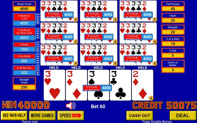 A superb hand by Heartyspirit, bringing in 40,000 credits. At a casino playing quarters, that would be $10,000.00!