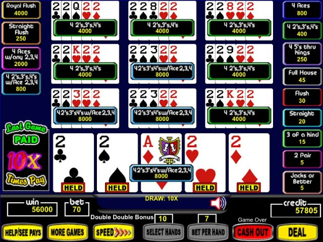 PanamaB scored 56,000 credits in this amazing game! That hand, if played in a casino with quarters, would have been worth $14,000.00.