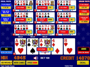 Deal Draw is an improved version of the old classic, Double Pay Poker. It's a fun bet with action on the deal and on the draw! Any winning combinations dealt in the opening hands are paid on the deal according to a unique "deal" pay table. After the deal, hold promising cards and draw to improve the hands, and get paid again for any winners at the final outcome according to a traditional, familiar pay table. Getting paid twice is awesome, and with Triple Play, Five Play and Ten Play options, your wins can really mount up!