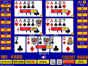 Build a Wheel Poker adds exciting wheel spin bonus action to three and five play games. Each natural dealt three of a kind or better reveals one slice of the wheel. If you are dealt a full house or better, all slices are revealed. One all slices are revealed, spin the wheel to win up to 10,000 additional credits!