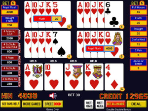 A 4-of-a-kind hand is a thrill for any player. As a tribute to serious quad-seekers, a 6-credit bet awards the standard win for a 4-of-a-kind, and initiates a distinctive pick 'em bonus round. In the bonus, 53 cards are presented face down - a standard deck plus one joker. The player is prompted to select 1, 2, or 3 cards revealing bonus wins up to 4000 credits for the Joker.