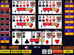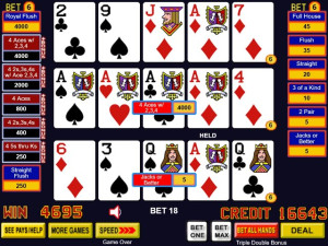 A 4-of-a-kind hand is a thrill for any player. As a tribute to serious quad-seekers, a 6-credit bet awards the standard win for a 4-of-a-kind, and initiates a distinctive pick 'em bonus round. In the bonus, 53 cards are presented face down - a standard deck plus one joker. The player is prompted to select 1, 2, or 3 cards revealing bonus wins up to 4000 credits for the Joker.