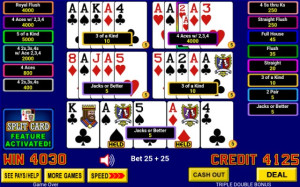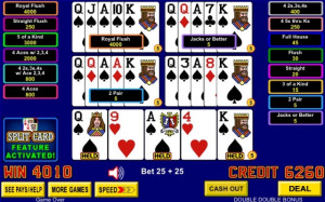 A thought provoking game where one card may "split" into another card of the same suit and value, or one value lower or higher. This gives the player 6 cards to make a hand. The "Split Card" appears both on the deal and the draw and occurs roughly every 4 hands The result is more quads, straights, flushes, straight flushes and royals as well as new pay categories.