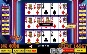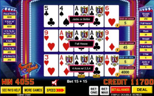 Super Hand Poker is a new twist on Triple Play Poker where you are dealt 3 independent hands. Any winning dealt hands are paid, and then the hand with the highest expected value is selected for the next round of play in traditional Triple Play fashion.