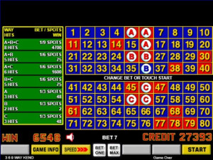 369 Way Keno is a keno variation with unique win combinations matching spots that correspond to lettered number selections.