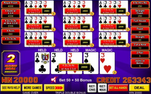 This fun game features a "magic card" that randomly appears roughly every 10 hands (see HELP menu for exact frequency). When activated, up to three magic cards per hand transform into the best card(s) to create the highest jackpot possible on every hand. This means more 4-of-a-Kinds and Royal Flushes!