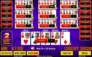 This fun game features a "magic card" that randomly appears roughly every 10 hands (see HELP menu for exact frequency). When activated, up to three magic cards per hand transform into the best card(s) to create the highest jackpot possible on every hand. This means more 4-of-a-Kinds and Royal Flushes!