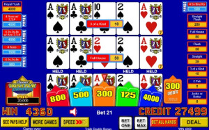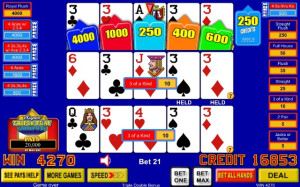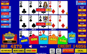 Super Triple Play Jackpots blends two all time favorite games into one. As with the traditional Super Triple Play game, all four of a kind jackpots are increased. In addition, there's a virtual on-screen bonus wheel spin, with a 20,000 or progressive credit slice for the top bonus award.