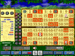 In Caveman Keno Plus, 3 eggs appear on non-chosen spots after the player initiates game play. Hatch at least 2 eggs on a winning card and you will earn three EXTRA balls. If 3 eggs turn into dinosaurs, you are awarded 8 times the win amount. If 2 eggs turn into dinosaurs, you are awarded 4 times the win amount.