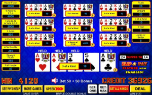 The Flip and Pay feature may be awarded when a dealt hand could be improved to a winning hand by changing the rank of one card (but not the suit) by one, providing the improved hand has a higher expected value. Expected value considers the potential of all possible flips and hold strategies.