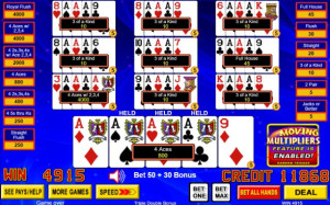 If the Moving Multipliers Feature is activated, a 2x-12x multiplier may be awarded on the bottom line. On the following deal, any multipliers previously awarded move up to the next hand location.