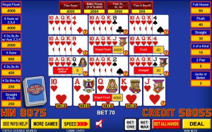 Stack the deck with the cards you need on qualifying deals for more great wins! For example, when dealt three-of-a-kinds and four to the royal, the bonus awards up to 5 of the specific cards needed to complete the quad or royal, dramatically increasing the number of high paying hands. This also adds some exciting new pay categories only possible with the additional cards added to the deck. Example: Dealt 3 aces needing the ace of diamonds for the win, the bonus populates the draw deck with 5 additional aces of diamonds so the odds of four aces go up by nearly 30%!