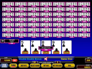 Play fifty hands at once with bets of up to five coins per hand. The first 5 cards are dealt face up. You choose which cards to hold, and those cards are automatically held in all fifty hands.