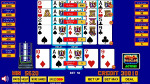 In Stack 'Em High Poker, when holding 2 or 3 aces, you are awarded several additional hands with the same cards. Any drawn ace is "sticky" and will duplicate and improve all your remaining hands. 3 aces become 4 and now you're just sweating the kicker. Extra hands expand into the top box creating additional excitement and possible bonuses.