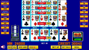 In Stack 'Em High Poker, when holding 2 or 3 aces, you are awarded several additional hands with the same cards. Any drawn ace is "sticky" and will duplicate and improve all your remaining hands. 3 aces become 4 and now you're just sweating the kicker. Extra hands expand into the top box creating additional excitement and possible bonuses.