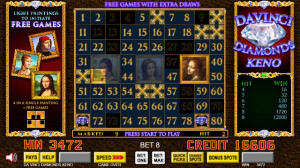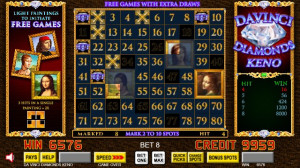 Da Vinci Diamonds Keno boasts more bonus features than ever with multipliers up to 6X and a free games bonus with falling jewels that award additional draws.