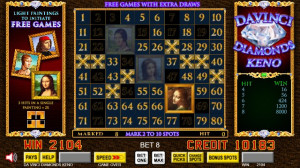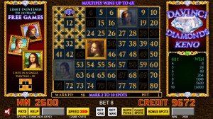 Da Vinci Diamonds Keno boasts more bonus features than ever with multipliers up to 6X and a free games bonus with falling jewels that award additional draws.