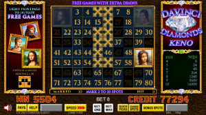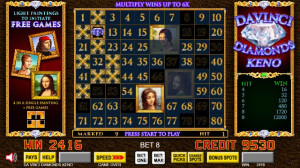Da Vinci Diamonds Keno boasts more bonus features than ever with multipliers up to 6X and a free games bonus with falling jewels that award additional draws.