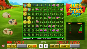 Alien Attack Keno is a fun new keno game offering fighting cows, abducting aliens, instant credit prizes, free bonus games, and paytable multipliers. There's a special "Pick-a-Prize" bonus that lets you pick one of 19 tiles, three of which will award a free Alien Attack game bonus (the others award instant credits). The Alien Attack game bonus lasts until the last cow is abducted and includes multipliers up to 5X.