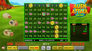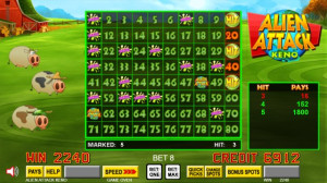 Alien Attack Keno is a fun new keno game offering fighting cows, abducting aliens, instant credit prizes, free bonus games, and paytable multipliers. There's a special "Pick-a-Prize" bonus that lets you pick one of 19 tiles, three of which will award a free Alien Attack game bonus (the others award instant credits). The Alien Attack game bonus lasts until the last cow is abducted and includes multipliers up to 5X.