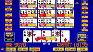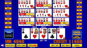 Power Stacks Poker is a thrilling game that rewards players with a "sticky" feature and bonus hands that result in 7 times as many four-of-a-kinds! When triggered, up to 16 bonus hands are awarded depending on the game selection. On bonus hands the sticky feature will duplicate cards that improve the dealt hand - so all subsequent hands include the winning card.