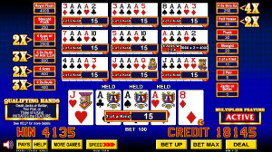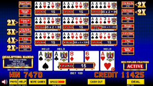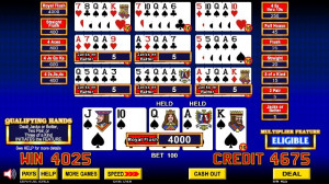 With multipliers up to 100X, this game is sure to take your breath away. Specific dealt hands trigger the bonus, where multipliers are awarded randomly to pay categories and create huge winning opportunities. Imagine a simple Full House, times 80... which could be worth 40 x 80 for 3,200 credits!