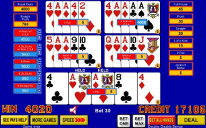 Super Triple Play is an offshoot of the wildly popular Triple Play game, but with a twist for every player who likes to get four-of-a kinds. For just one extra coin per hand, players get a shot at winning double and even triple the normal jackpot on four-of-a kinds. Instead of 400 for four 3s, how about 800? Everyone loves quads and this game makes them even better!