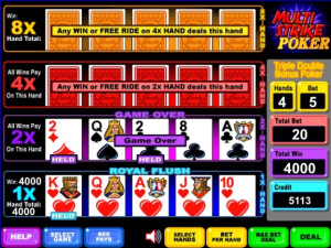 Standard single-hand play will never be the same as you climb a ladder to riches playing your favorite draw poker game the Multi-Strike Poker way. Play the first hand of up to four possible separate hands of video poker using the standard pay table. With a winning hand, the heart-pounding excitement continues with a new deal from a fresh deck and double the pay-table value on the second rung. You will love the chance to climb to the summit by winning three hands in a row, because the top pay table lavishes eight times the payout for a chance at 32,000 points for a royal flush (when playing five points per hand)!
