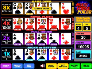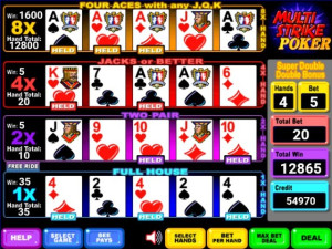 Standard single-hand play will never be the same as you climb a ladder to riches playing your favorite draw poker game the Multi-Strike Poker way. Play the first hand of up to four possible separate hands of video poker using the standard pay table. With a winning hand, the heart-pounding excitement continues with a new deal from a fresh deck and double the pay-table value on the second rung. You will love the chance to climb to the summit by winning three hands in a row, because the top pay table lavishes eight times the payout for a chance at 32,000 points for a royal flush (when playing five points per hand)!