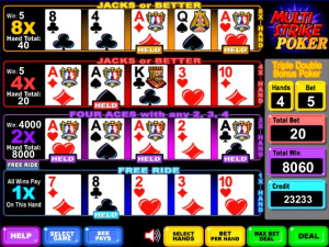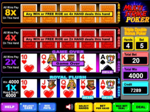 Standard single-hand play will never be the same as you climb a ladder to riches playing your favorite draw poker game the Multi-Strike Poker way. Play the first hand of up to four possible separate hands of video poker using the standard pay table. With a winning hand, the heart-pounding excitement continues with a new deal from a fresh deck and double the pay-table value on the second rung. You will love the chance to climb to the summit by winning three hands in a row, because the top pay table lavishes eight times the payout for a chance at 32,000 points for a royal flush (when playing five points per hand)!