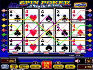 Spin Poker, one of the most popular video poker games of all time, is now enhanced with the newest feature to hit poker: the Dream Card. Maximum wagers with a side bet of 5 credits per hand increase odds of winning a Dream Card. If the Dream Card feature is awarded, the best possible 5th card, based on the first four cards, appears. You are rewarded for taking a chance on this dreamy side bet.