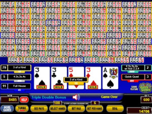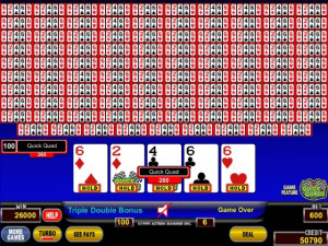 Quick Quads just got 100 times more exciting! Turn a 3-of-a-kind hand into a 4-of-a-kind Quad winner, now with one hundred opportunities at a time! A sixth credit wagered funds the bonus without taking anything away from the standard pay table. After the draw, if the player's hand is a 3-of-a-kind, the two non-matching cards - ace (1) through 9 - are added together. If the sum is equal to the rank of the 3-of-a-kind, the player is awarded the 4-of-a-kind pay. Only 3-of-a-kind 2s through 10s can be made 4-of-a-kind using the bonus feature.