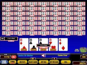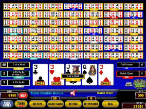 Quick Quads just got 50 times more exciting! Turn a 3-of-a-kind hand into a 4-of-a-kind Quad winner, now with fifty opportunities at a time! A sixth credit wagered funds the bonus without taking anything away from the standard pay table. After the draw, if the player's hand is a 3-of-a-kind, the two non-matching cards - ace (1) through 9 - are added together. If the sum is equal to the rank of the 3-of-a-kind, the player is awarded the 4-of-a-kind pay. Only 3-of-a-kind 2s through 10s can be made 4-of-a-kind using the bonus feature.