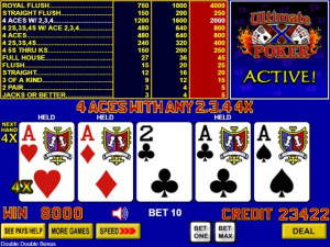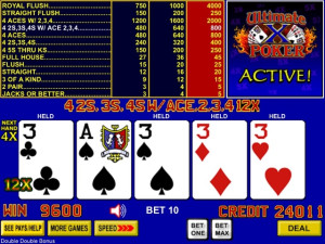 Available on Five Star Poker machines. A bonus multiplier is awarded to each active hand ending in a winning combination. The value of the multiplier is determined by the pay schedule and is applied to any wins received in that hand in the next game. This makes Ultimate X Poker a theme where each successive hand is almost guaranteed to be more exciting than the last!