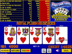 Available on Five Star Poker machines, this game is enhanced with the newest buy-a-pay feature to hit poker: The Dream Card. A maximum bet increases the chances of winning a Dream Card. If the extra wager is placed and the feature awards it, optimal autohold strategy is employed to pick the perfect card to complete the dealt hand. Players are given the card yielding the highest expected return. In other words, players can count on a 4-of-a-kind in place of a 3-of-a-kind on the deal!