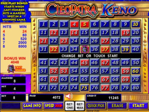 Cleopatra Keno is an exciting video keno game with a free play bonus if the last number drawn hits a marked spot in a winning game. The bonus is 12 free plays where any wins are multiplied by two.