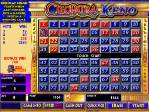 Cleopatra Keno is an exciting video keno game with a free play bonus if the last number drawn hits a marked spot in a winning game. The bonus is 12 free plays where any wins are multiplied by two.